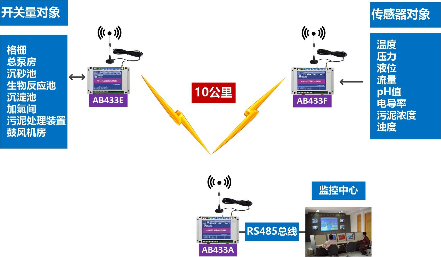 开关量控制模块:AB433E系列产品根据一定的程序、时间和逻辑关系集中控制污水处理过程中的设备起停,对远程现场的运行设备进行监测和控制,与控制中心通过无线连接;