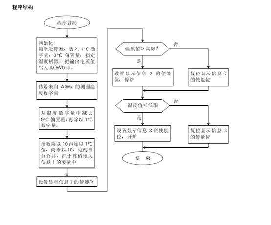 为了把PT100的随温度变化的电阻转换成电压,模拟量输出作为恒电流源而使用,即输出12.5mA随电流供给PT100传感器。在这个电路中,产生了5mV/0C的线性输入电压。EM235把这个电压转换成数字量,程序周期性地读这些数字量,并将所读的这些数,利用下面的公式计算出温度。