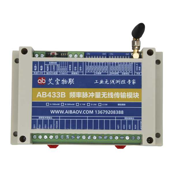 AB433B无线终端的脉冲量输入端由光电隔离实现,脉冲量输出端由功率MOS管实现。支持4-20mA,0-5V等传感器信号。可将A点的频率脉冲量模拟量信号无线传输到B点,同时可将B点的频率脉冲量模拟量信号无线传输到A点。可以工作在点对点模式:A和B两个点之间互相透传频率脉冲量模拟量;也可以工作在点对多模式:A点同时和B点、C点、D点...之间无线透传频率脉冲量模拟量。AB433B无线终端采用无线电数字加密通信技术,抗干扰能力强,可替代电缆,无需挖沟布线,大大降低企业人力物力成本,减少施工和维护难度。 AB433B无线终端具有4/8/16/32路等多种频率脉冲量模拟量输入/输出点数,点数可根据用户需求自由配置。针对工业用户,全工业级防雷设计,久经工业现场考验,质量稳定可靠。免编程,拨码开关即可设置所有工作参数。产品体积小巧,标准导轨安装。广泛应用于工业自动化、厂矿、电力、水利、环保、农业、交通、军工、安防等领域。 |