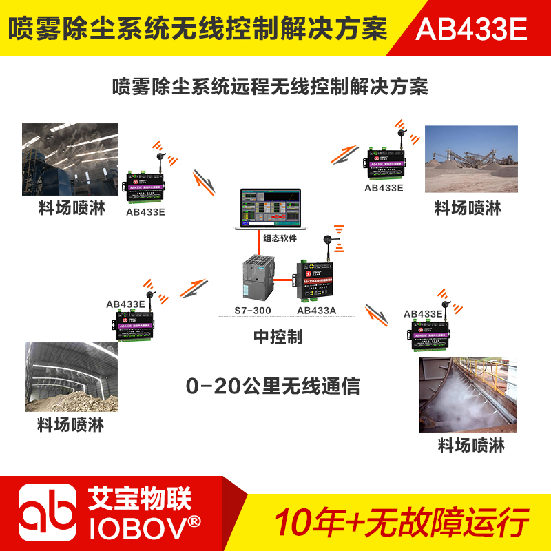现场50个喷头分布于2公里区域,每个喷头配电磁阀。中控室通过S7-300PLC和组态软件实现无线控制。采用艾宝物联AB433A/AB433E模块构建高效稳定无线喷雾除尘系统,确保长距离、高可靠数据传输。中控室S7-300PLC经AB433A模块发送至喷头电磁阀,同时接收现场状态反馈。每喷头安装电磁阀与AB433E模块,实现精准控制与状态监测。
